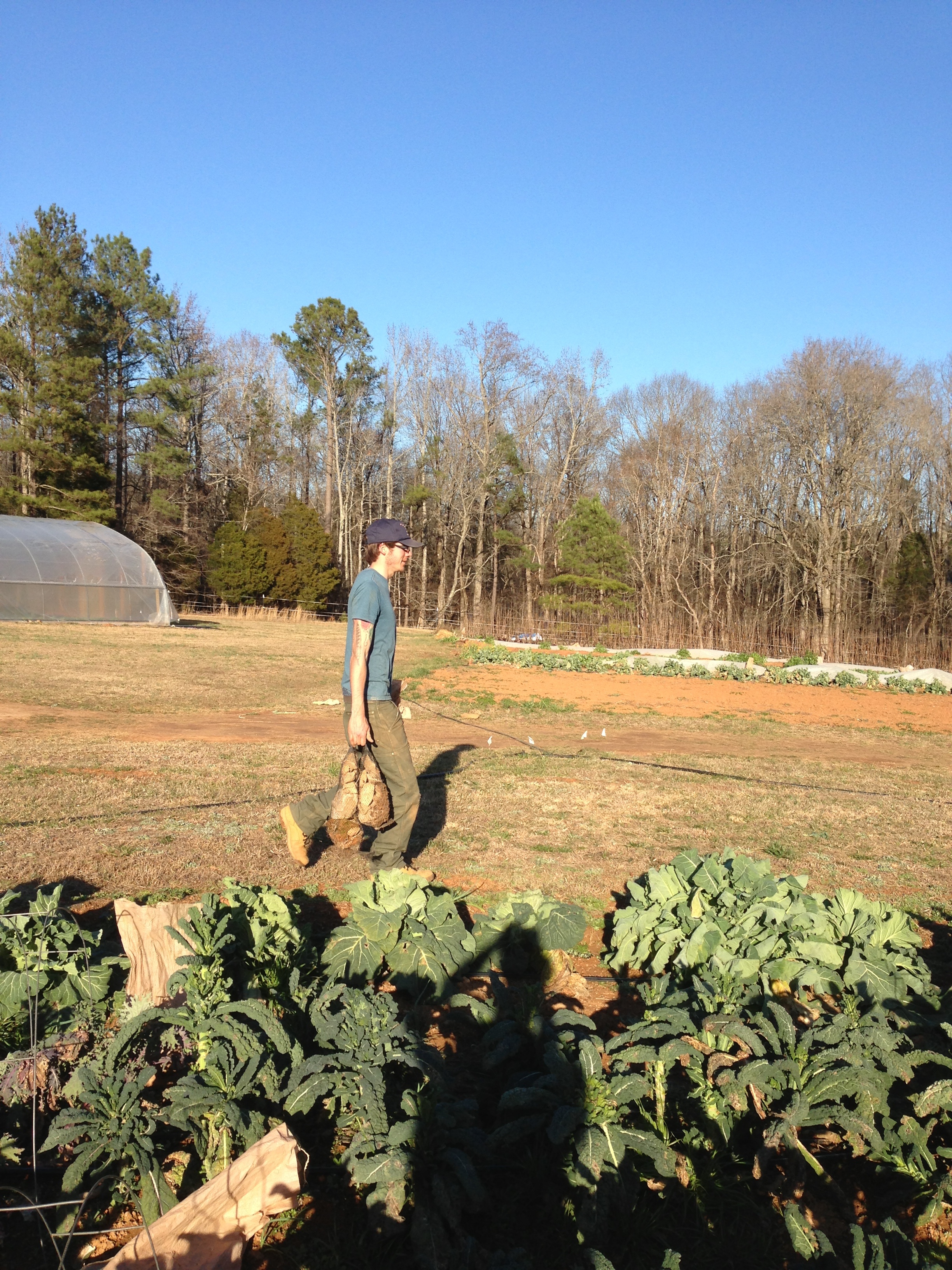 It got down to 16 degrees last night, but we had prepared the best we could. Above, you can see our new CCCC intern, Austin (more about him later), carrying bags of rocks to hold down some row cover. We covered a lot of things (kale, carrots, beets, salad mix, lettuce, chard, cabbages) and some of it we left uncovered (more of the kale, the collards, rutabagas, hoop house carrots, hoop house spinach). We were happy to discover that everything did quite well. It only got down to 46 degrees in our passive solar propagation greenhouse, so the seedlings that will become our Spring plantings are just fine.
